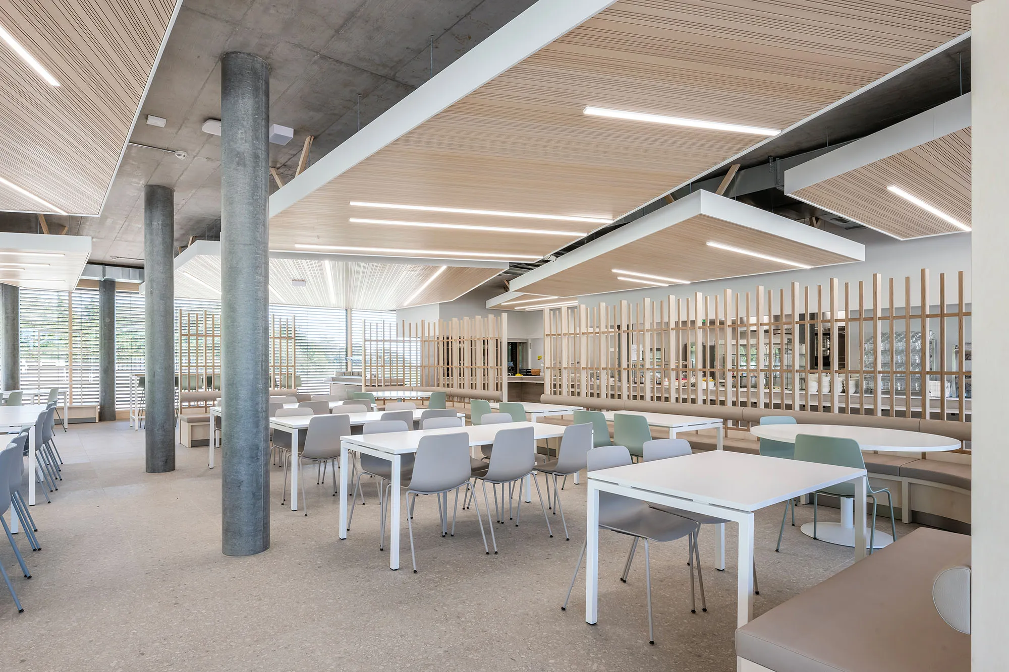 Sur le plan énergétique, le bâtiment est durable : panneaux solaires, capteurs de CO2 dans chaque classe pour une ventilation efficace, pompes à chaleur et isolation renforcée assurent des performances élevées, selon les principes Minergie – sans viser spécifiquement ce label. Pour prévenir les infiltrations liées à l’humidité du terrain, une cuve de rétention a été installée au sous-sol.